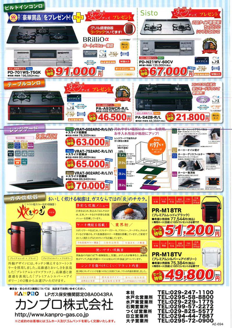 カンプロは、9月末までの大特価キャンペーンを開催します! ビルトインコンロをご成約のお客様に、もれなく『すぐラクグッズ』をプレゼントいたします。 更に、対象商品をご購入の方には、必ずもらえるギフト券や、抽選で宿泊券などをプレゼント。 他にも、テーブルコンロやお手入れしやすいレンジフード、ガスならではのおいしいご飯が炊ける炊飯器もご用意。 増税前の最後の大特価ですので、このチャンスをお見逃しなく!