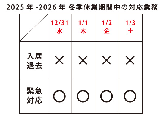 2026年1月4日(日)は入退去のみ事前予約で承ります。